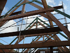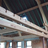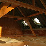 Het weer zit best mee, dus kan er doorgewerkt worden aan zowel het dak als de elektriciteit. De zichtbare spanten zijn zo goed als geplaatst en geven een goed beeld van wat we later zullen zien vanuit de kamers en gang. Normaal zou eind volgende week het dak al volledig dicht kunnen zijn (zonder pannen)! Dat zal dan zeker al wat droger werken, daar de hele vloer nu nog onder een 10cm water staat.