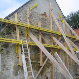 Alle afbraakwerken zijn goed verlopen. Alleen de zijgevel van het voormalige woonhuis, waar wij ons in genesteld hebben, heeft er een beetje onder geleden. Aangezien deze deel uitmaakte van één van de muren van de schuur hebben we deze moeten laten stutten. Voor de kenners noemt dit schoren laten zetten.